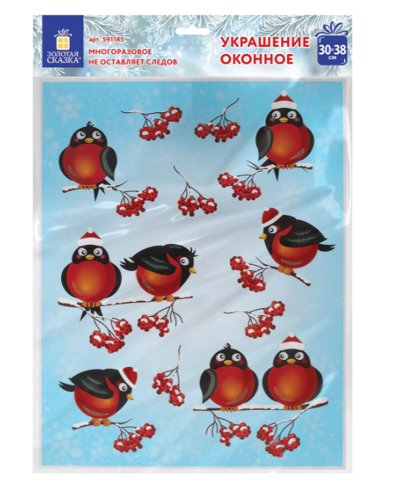 Наклейка на стекло двусторонняя МНОГОРАЗОВАЯ 30*38см Снегири, ЗОЛОТАЯ СКАЗКА
