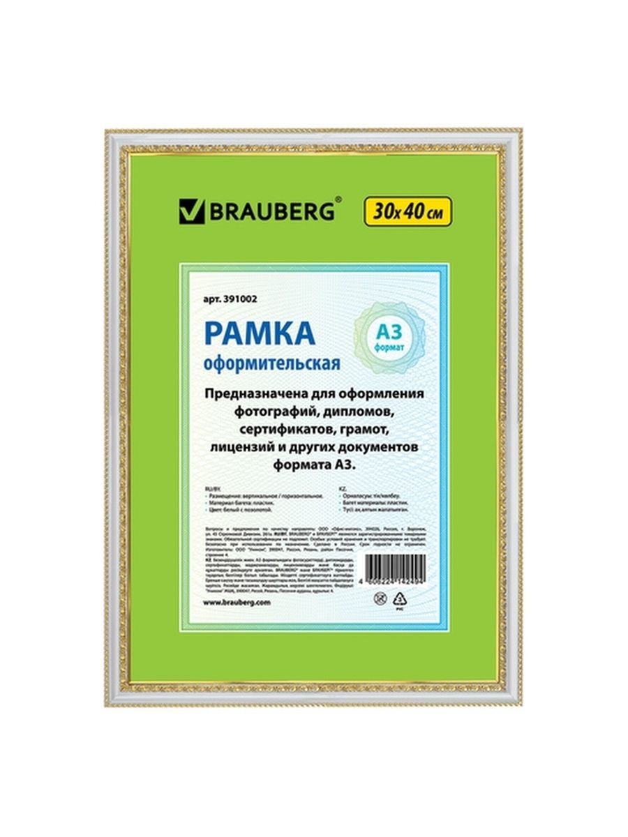 Рамка 30*40см, пластик, багет 30 мм, BRAUBERG HIT4, белая с двойной позолотой, стекло