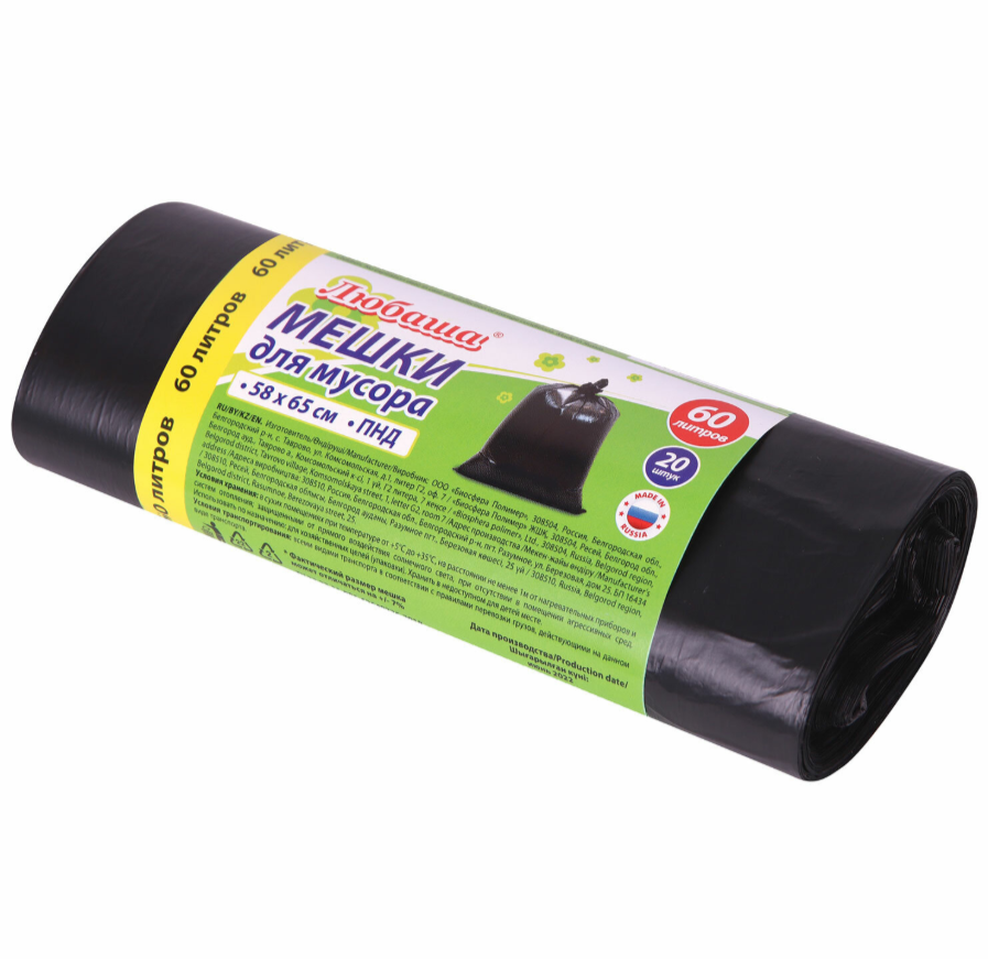 Мешки для мусора 60л черные в рулоне 20 шт, ПНД 8 мкм, 58х65см, ЛЮБАША,608092