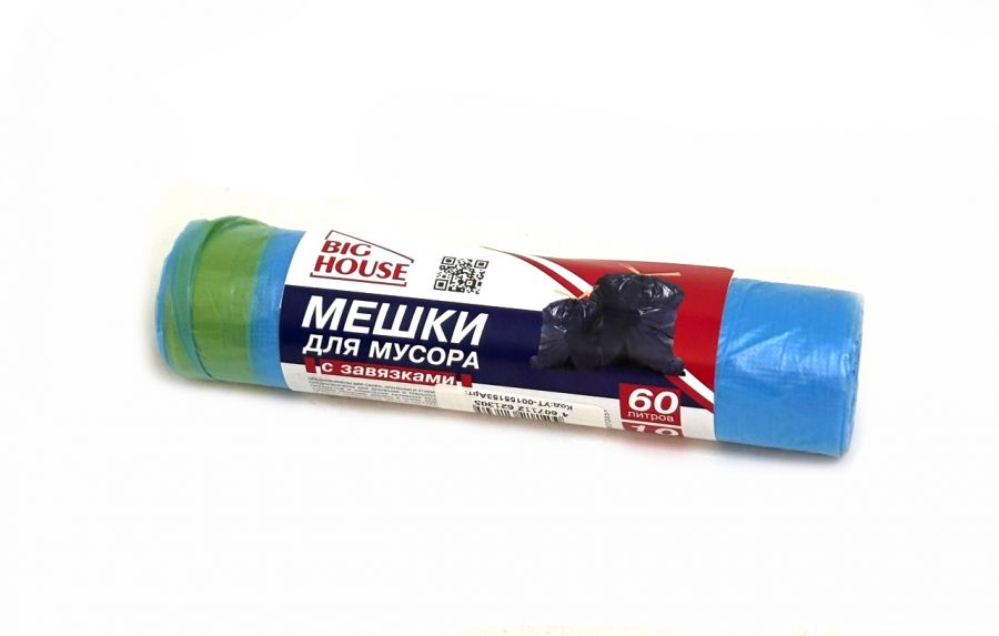 Мешки д/мусора с завязками 10шт 60л.BIG HOUSE ПНД, 15 мкм