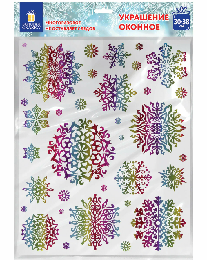 Наклейка на стекло двусторонняя МНОГОРАЗОВАЯ 30*38см Снежинки, голография ЗОЛОТАЯ СКАЗКА