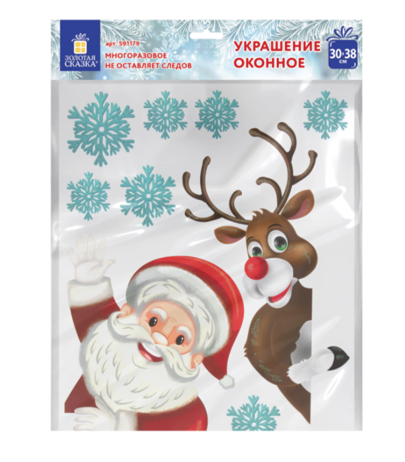 Наклейка на стекло двусторонняя МНОГОРАЗОВАЯ 30*38см Дед Мороз и олень, ЗОЛОТАЯ СКАЗКА
